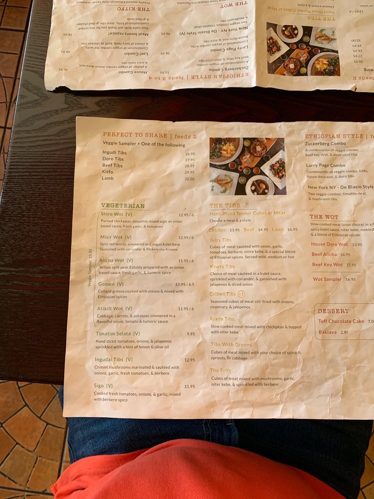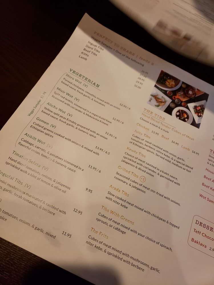 veggie sampler, Grilled lamb, beef Alicia (non spicy turmeric sauce), and chicken juicy tibs